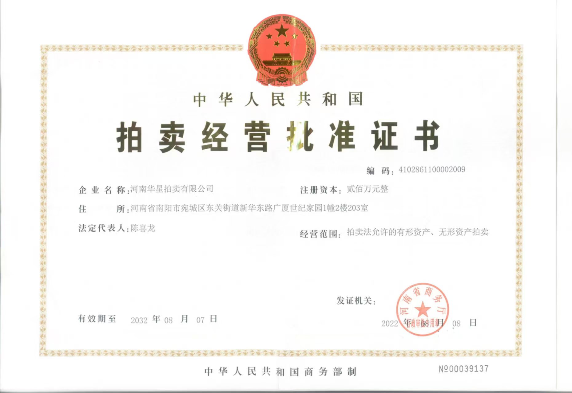 2013年7月取得南陽市人民政府指定、河南省財政廳頒發河南省公物拍賣資格證書